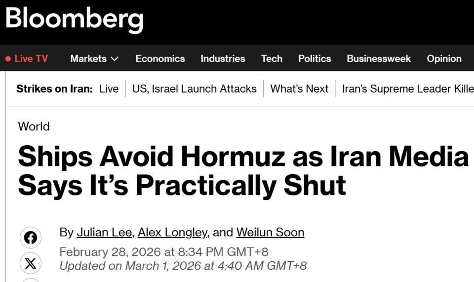 周六,彭博社报道称,多家航运和保险机构立即作出反应。美国交通部敦促商船远离波斯湾;波罗的海国际航运公会(BIMCO)指出,即使仅存在安全疑虑,保险费也会大幅上涨,导致商业航运难以维持。部分小型油轮和散货船虽仍在尝试通行,但大型油轮已几乎全面停摆。
